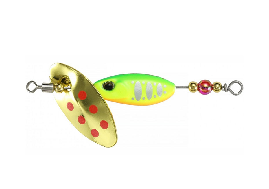 An original In-line spinner spoon with a voluminous realistic core weighing 5.0 g. The petal is a classic In-line: attached without a clamp. It has a fairly powerful game; the spinner is visible to fish from a great distance. The axle is stainless, with an integrated swivel and a scarlet bead near the tee, which serves as an aiming point.