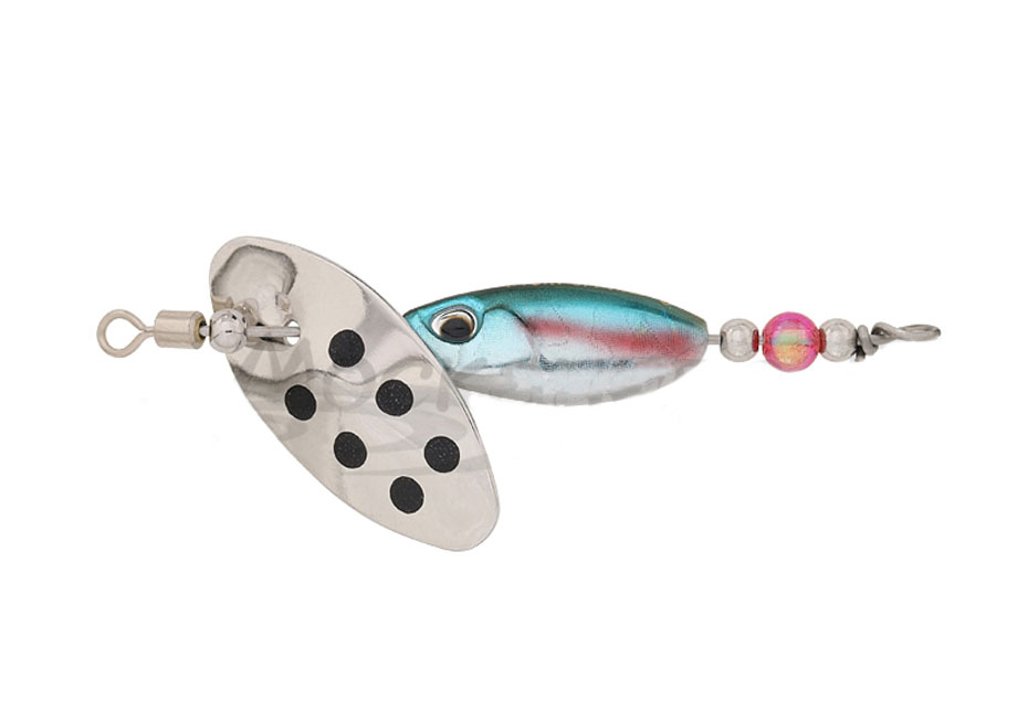 Oryginalna łyżka obrotowa In-line z obszernym, realistycznym rdzeniem o wadze 3,5 g. Płatek jest klasycznym In-line: mocowany bez zacisku. Ma dość mocną grę, błystka jest widoczna dla ryb z dużej odległości. Oś jest wykonana ze stali nierdzewnej, ze zintegrowanym krętlikiem i szkarłatnym koralikiem w pobliżu trójnika, który służy jako punkt celowania.