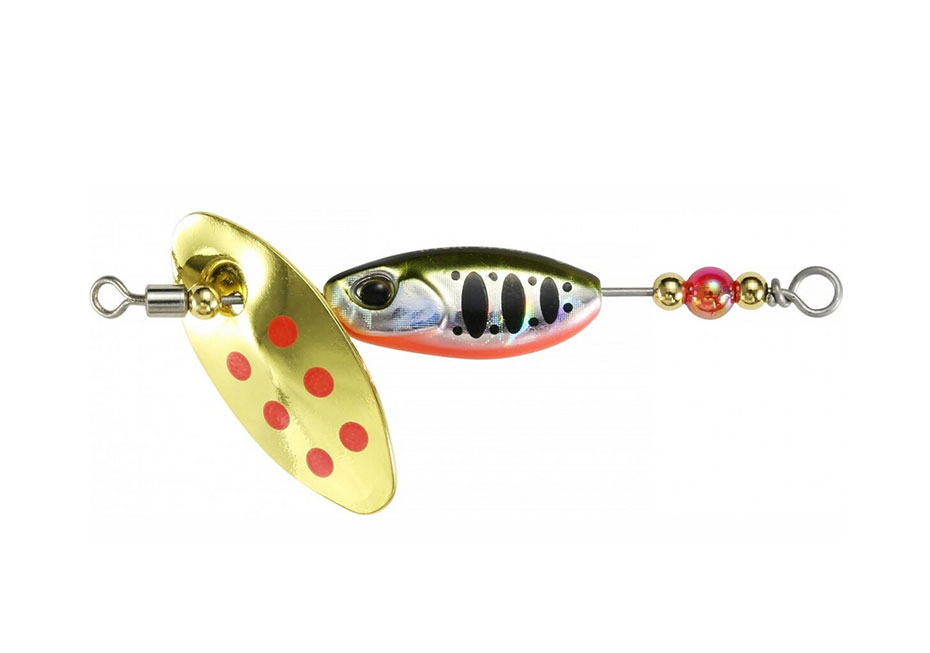 Oryginalna łyżka obrotowa In-line z obszernym, realistycznym rdzeniem o wadze 5,0 g. Płatek jest klasycznym In-line: mocowany bez zacisku. Ma dość mocną grę, błystka jest widoczna dla ryb z dużej odległości. Oś jest wykonana ze stali nierdzewnej, ze zintegrowanym krętlikiem i szkarłatnym koralikiem w pobliżu trójnika, który służy jako punkt celowania.